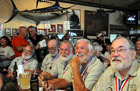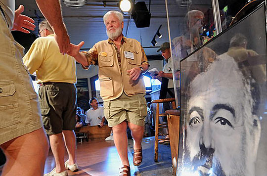 7月23日,“山寨”海明威大賽在在美國佛羅里達(dá)州海島小城基韋斯特的“邋遢喬”酒吧舉行。今年7月21日是海明威誕辰110周年紀(jì)念日。每年這個(gè)日子前后,海明威上世紀(jì)30年代曾居住過的佛羅里達(dá)州基韋斯特都會(huì)舉辦名為“海明威日”的系列紀(jì)念活動(dòng)。其中最著名的就是在“邋遢喬”酒吧舉行的海明威模仿大賽,評(píng)選模仿海明威衣著、神態(tài)最像的人。