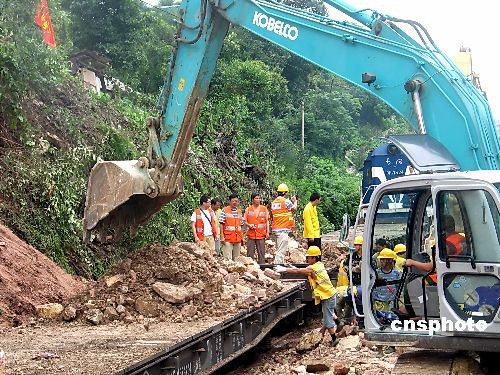 經(jīng)過上千名鐵路職工和武警官兵24小時(shí)不間斷搶修,暴雨天氣引發(fā)巖石崩塌而被迫中斷的滬昆鐵路,在中斷40小時(shí)后于2009年7月8日7時(shí)18分恢復(fù)通車。