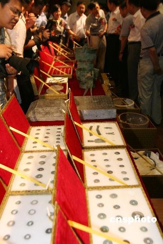 7月14日上午,河南省文物局和安陽(yáng)市在河南博物院多功能廳舉行河南省征調(diào)文物入藏儀式,將河南博物院和河南省文物考古研究所收藏的193件有關(guān)文字的文物移交中國(guó)文字博物館收藏。這批移交的文物包括河南博物院藏“十六年鄭令”戈、銅“部曲將”印、曾子甗等123件文物和河南省文物考古研究所藏的賈湖龜腹甲刻符、新蔡葛陵楚墓竹簡(jiǎn)、溫縣盟書、長(zhǎng)子口鼎、、薳子昃鼎、平夜君成戈、垂球等不同歷史時(shí)期的各門類文物70件。中新社發(fā) 王中舉 攝