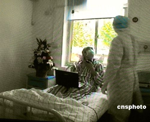 五月十三日中午,在山東省城濟(jì)南市傳染病醫(yī)院接受治療的輸入性甲型H1N1流感疑似患者呂某某目前身體、精神各情況已基本恢復(fù)。疑似患者呂某某在十一日晚剛從濟(jì)南火車站下車時體溫一度高達(dá)三十八點九攝氏度。經(jīng)過濟(jì)南市傳染病醫(yī)院的醫(yī)護(hù)治療,體溫已降至三十六點七攝氏度。圖為記者從醫(yī)院監(jiān)控系統(tǒng)的電視屏幕上拍到的患者正在與醫(yī)生交談。中新社發(fā) 張璐 攝