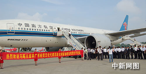 5月21日上午,廣西壯族自治區(qū)主席馬飚率領(lǐng)廣西經(jīng)貿(mào)文化代表團乘坐包機從廣西南寧機場起飛,開始飛赴臺灣,廣西由此成為中國大陸各省、自治區(qū)、直轄市中第一個由省長級官員率團赴臺進行經(jīng)貿(mào)文化交流的省份,此行也成為海峽兩岸交流史上的新突破。 馬飚率團此行赴臺是參加“兩岸產(chǎn)業(yè)高峰會議——2009年桂臺經(jīng)貿(mào)合作論壇”,廣西經(jīng)貿(mào)文化代表團人數(shù)多達1000余人,這也是大陸赴臺人數(shù)最多的參訪團。劉萬強 攝