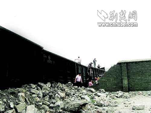 昨日(5月31日)清晨6時(shí)許,荊門石化軍馬場貨場里,工人在連接列車車廂時(shí)剎車失控,9節(jié)滿載煤炭的車廂脫軌撞垮貨場圍墻,橫在圍墻外的軍馬場路上。所幸該處比較偏僻,事發(fā)時(shí)路上人車稀少,未造成人員傷亡。
