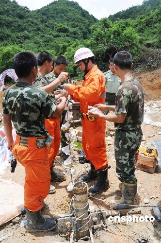 6月7日,發(fā)生塌方事故的三亞繞城高速公路隧道救援工作繼續(xù)緊張有序進(jìn)行。6月6日12時(shí)許,救援人員打通了一條通向被困人員所在處的補(bǔ)給通道,救援人員每隔三個(gè)小時(shí)左右給被困的8名施工人員進(jìn)行一次補(bǔ)給。目前,被困人員在隧道內(nèi)有充足的食物和飲用水,情緒穩(wěn)定,耐心等待救援。圖為7日13許,消防官兵通過補(bǔ)給通道給被困8名施工人員進(jìn)行第8次補(bǔ)給,補(bǔ)給的食物包括雞蛋、火腿腸、牛奶、“紅!憋嬃、小籠包,以及救援時(shí)將用到的防毒面具。中新社發(fā) 胡劍兵 攝