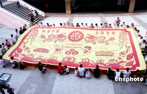 2009年7月5日,濟(jì)南剪紙藝術(shù)院的工作人員和市民在濟(jì)南市泉城廣場展示巨幅剪紙作品。當(dāng)天是第十一屆全運(yùn)會倒計(jì)時100天,濟(jì)南剪紙藝術(shù)院的120多名藝人耗時6個月,共同創(chuàng)作完成巨幅剪紙作品。據(jù)了解,該作品總面積61.6平方米,長11米(寓意第十一屆全運(yùn)會),寬5.6米(寓意56個民族),主題為和諧中國、全民全運(yùn)。作品中的圖案包含十一全運(yùn)會標(biāo)志、吉祥物泰山童子、荷花(濟(jì)南市花)、泉水等。中新社發(fā) 龔輝 攝