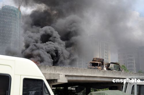 7月12日9時(shí)50時(shí)許,廣州市環(huán)城高速東圃路段,兩車相撞燃燒。車子燃燒的火苗有3米多高,該市環(huán)城高速東圃路段同方向車輛被堵近5公里長(zhǎng)。據(jù)高速橋下一位洗車師傅說,兩車是同相行駛,相撞時(shí)間大概是凌晨3點(diǎn)左右,先是一輛貨車燒著了,到上午9時(shí)許,另一車接著燃燒。10時(shí)59分,消防車趕到事發(fā)現(xiàn)場(chǎng)展開援救。截止發(fā)稿時(shí)間,大火已被撲滅,人員傷亡情況正在調(diào)查中。中新社發(fā) 陸建東 攝