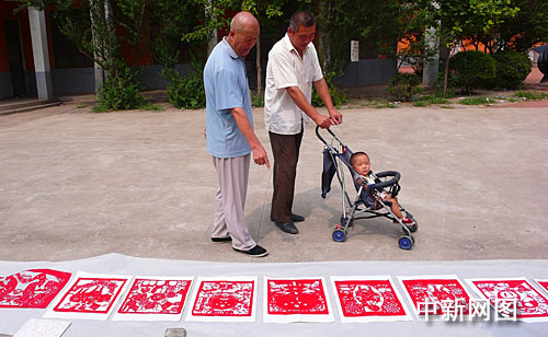 中新網(wǎng)7月30日電(馮文芳)鮮紅的壽桃、雄偉的天安門、莊嚴(yán)的國徽、挺拔的華表、歡樂的民族舞蹈……日前,侯馬民間老藝人李傳源精心創(chuàng)作出60幅剪紙作品,慶祝祖國六十華誕。
