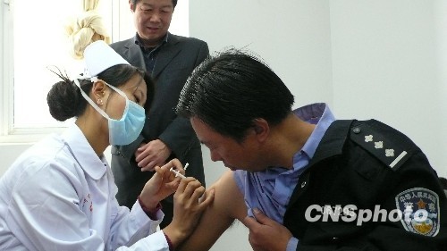2009年11月5日,安徽省亳州市一線(xiàn)公安干警正在接種甲型流感疫苗。當(dāng)日,在安徽省亳州市第一批52500劑甲型流感疫苗開(kāi)始接種,據(jù)市衛(wèi)生部門(mén)負(fù)責(zé)人介紹,因?yàn)橐呙绲臄?shù)量有限,按照省里計(jì)劃,這批疫苗的接種重點(diǎn)人群是,中小學(xué)教師和學(xué)生、公安干警、交通運(yùn)輸部門(mén)工作人員、殯葬工作人員,還有醫(yī)療衛(wèi)生部門(mén)的臨床一線(xiàn)和公共衛(wèi)生人員等。對(duì)于這批甲型流感疫苗,亳州市衛(wèi)生部門(mén)還確定了專(zhuān)門(mén)人員,確保對(duì)重點(diǎn)人群進(jìn)行接種。中新社發(fā) 劉勤利 攝