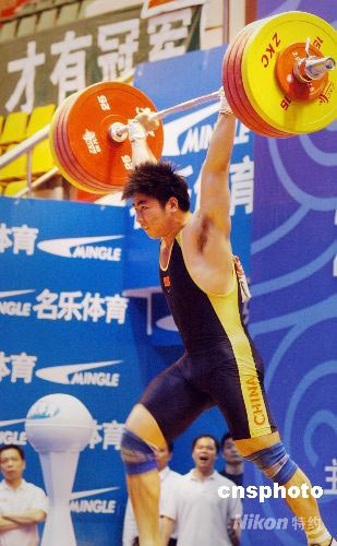四月二十二日下午,二00八年全國男子舉重錦標(biāo)賽暨奧運(yùn)會選拔賽第十二場比賽在僑鄉(xiāng)泉州體育館進(jìn)行,來自全國各代表隊的八十五公斤級選手展開了異常激烈的角逐,來自廣西的運(yùn)動員陸永以抓舉一百八十公斤的成績打破了亞洲紀(jì)錄、挺舉二百一十三公斤打破了全國紀(jì)錄、總分三百九十三公斤的成績打破亞洲紀(jì)錄,奪得三項冠軍,成為此次全錦賽的冠軍王。中新社發(fā) 傅丹丹 攝