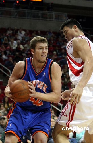 當(dāng)?shù)貢r(shí)間1月10日晚,主場(chǎng)作戰(zhàn)的火箭隊(duì)以96比76大勝紐約尼克斯隊(duì)。斯科拉和姚明今天聯(lián)手內(nèi)線(xiàn)有不錯(cuò)發(fā)揮,火箭全隊(duì)多點(diǎn)開(kāi)花,第三節(jié)火箭隊(duì)打出進(jìn)攻高潮,最終擊敗尼克斯,取得三連勝。中新社發(fā) 歐文 攝