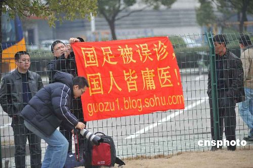 1月21日,國足將在杭州黃龍?bào)w育中心應(yīng)戰(zhàn)亞洲杯預(yù)選賽的第二個(gè)對(duì)手越南隊(duì)。今天,國足來到體育場(chǎng)開始簡(jiǎn)單熱身。現(xiàn)場(chǎng)球迷拉起橫幅“國足被誤診 國人皆庸醫(yī)”,國足隊(duì)員先后步入球場(chǎng),執(zhí)著的球迷依然撐著橫幅,站在場(chǎng)外。 中新社發(fā) 陳穎 攝