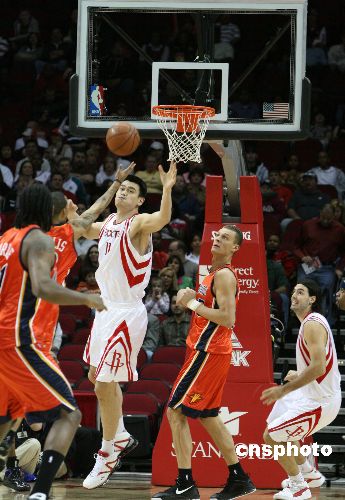 當(dāng)?shù)貢r間1月31日,姚明領(lǐng)銜的火箭隊(duì)以110比93戰(zhàn)勝勇士擺脫連敗陰影。姚明上場34分鐘14投9中,得到25分11個籃板。中新社發(fā) 歐文 攝