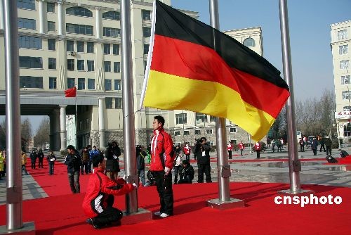 2月14日上午10時(shí),第24屆世界大學(xué)生冬季運(yùn)動(dòng)會(huì)德國體育代表團(tuán)歡迎儀式暨德國體育代表團(tuán)升旗儀式在黑龍江大學(xué)大運(yùn)村升旗廣場舉行。大運(yùn)村執(zhí)行村長張政文、村長助理張曉光以及德國代表團(tuán)團(tuán)長羅蘭·約希姆一行6人出席了此次歡迎儀式。這是大運(yùn)村首次為國外代表團(tuán)舉行的歡迎儀式。中新社發(fā) 姚庭山 攝