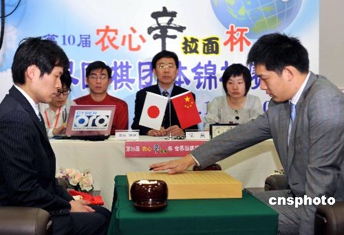 二月十七日,第十屆“農心杯”世界圍棋團體錦標賽第三階段比賽在上海舉行,首戰(zhàn)由中國棋手常昊九段(右)挑戰(zhàn)日本擂主高尾紳路九段(左),本階段比賽將決出最后冠軍和2億韓元冠軍獎金的歸屬。中新社發(fā) 湯彥俊 攝