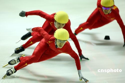 2月20日,大冬會短道速滑比賽在哈爾濱理工大學(xué)滑冰館繼續(xù)進行。在女子500米的比賽中,中國選手表現(xiàn)神勇,包攬了該項比賽的前四名。其中劉秋宏(前)以44秒862的成績問鼎冠軍,為中國隊在本屆大冬會上奪得第二枚金牌。李文文和孟曉雪分獲銀牌與銅牌,成績?yōu)?4秒929和45秒084。中新社發(fā) 富田 攝