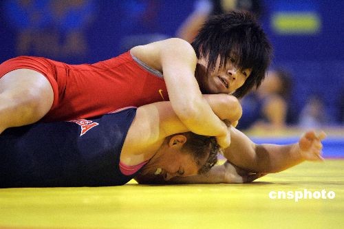 3月21日上午,由國(guó)際摔跤聯(lián)合會(huì)主辦,中國(guó)摔跤協(xié)會(huì)、太原市政府、山西省體育局承辦的“2009年女子摔跤世界杯比賽”將于今日在太原拉開(kāi)戰(zhàn)幕。在進(jìn)行的小組賽第一輪中,奧運(yùn)冠軍王嬌領(lǐng)銜的中國(guó)隊(duì)以總比分5:2戰(zhàn)勝日本隊(duì),贏得開(kāi)門(mén)紅。中新社發(fā) 張?jiān)?攝