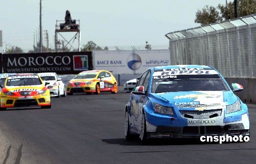 在5月3日進(jìn)行的2009世界房車(chē)錦標(biāo)賽(WTCC)第三站——摩洛哥馬拉喀什(Marrakech)站中,雪佛蘭車(chē)隊(duì)展現(xiàn)出非凡的實(shí)力。車(chē)手羅伯·胡夫(Rob Huff)和尼科拉·拉里尼(Nicola Larini)駕駛的雪佛蘭科魯茲力壓群雄分別贏得了第一和第二回合比賽勝利,從而使雪佛蘭車(chē)隊(duì)首次包攬兩回合比賽的冠軍,完成了歷史性的突破。圖為尼科拉·拉里尼在比賽中。中新社發(fā) 趙振清 攝
