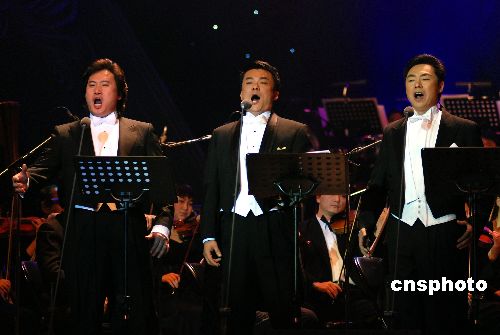 10月24日晚,華人三大男高音丁毅、范競馬、戴玉強在北京傾情高歌,由此,《我們的奧運》之“全球華人三大男高音”世界巡演音樂會正式啟動。當晚,三人除了演唱西洋經(jīng)典歌劇選段《今夜無人入睡》、《重歸蘇蓮托》等外,還演唱了多首中國民歌和祝福奧運的《北京頌歌》。承辦方華視嘉禾介紹說,“三高”此次巡演是代表全球華人藝術家向北京2008年奧運會獻上的一份祝福,也是表達對不久前去世的世界著名男高音歌唱家帕瓦羅蒂的緬懷。不久前,丁毅、范競馬、戴玉強已通過工商局注冊為“華人·三高”的品牌。至此,中國聲樂界也有了“三高”。他們表示,“三高”的提法并非指“中國最頂尖的三大男高音”,而只是眾多優(yōu)秀男高音之中具有代表性的三位。中新社發(fā) 李學仕 攝