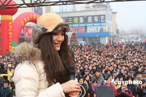 2009年1月4日下午,中國著名模特瞿穎向在邢臺上學(xué)的四川災(zāi)區(qū)學(xué)生捐贈保暖衣50套,為他們送去冬日里的溫暖。中新社發(fā) 陳雷 攝