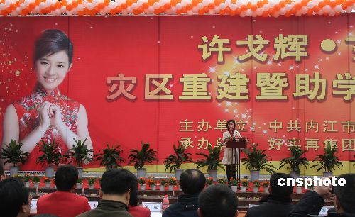 2008年1月6日,由中共四川省內(nèi)江市委、四川省內(nèi)江市人民政府主辦的“許戈輝災(zāi)區(qū)重建暨助學(xué)募捐活動(dòng)”在該市東興區(qū)大千廣場(chǎng)隆重舉行,香港鳳凰衛(wèi)視著名主持人許戈輝現(xiàn)場(chǎng)為“汶川大地震”災(zāi)區(qū)的貧困學(xué)子募集善款,受到當(dāng)?shù)厝罕姷膹V泛關(guān)注。在活動(dòng)現(xiàn)場(chǎng),許戈輝聲情并茂地暢談了自己在地震災(zāi)區(qū)的見(jiàn)聞,呼吁社會(huì)各界都來(lái)關(guān)注災(zāi)區(qū)、支援災(zāi)區(qū),為更多的貧困學(xué)子提供幫助、送去溫暖,并帶頭向?yàn)?zāi)區(qū)捐贈(zèng)8萬(wàn)元人民幣。在許戈輝的帶動(dòng)下,國(guó)際獅子總會(huì)、好實(shí)再集團(tuán)及內(nèi)江市的部分企業(yè)紛紛上臺(tái)奉獻(xiàn)愛(ài)心,共捐出300萬(wàn)元人民幣。據(jù)了解,這些善款將用于災(zāi)區(qū)希望小學(xué)建設(shè)和支持災(zāi)區(qū)重建。中新社發(fā) 蘭自濤 攝