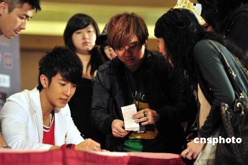 二月二十六日,臺(tái)灣組合“飛輪海”在香港一商場舉行簽名活動(dòng),為其即將舉行的演唱會(huì)造勢(shì)。中新社發(fā) 譚達(dá)明 攝