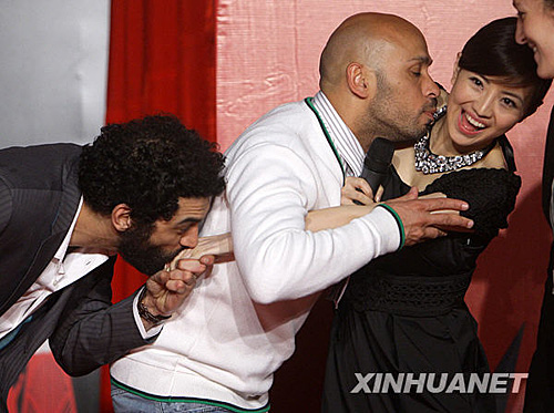 4月9日,法國(guó)電影《孤獨(dú)二兄弟》的導(dǎo)演兼主演、法國(guó)家喻戶曉的笑星組合朗茲·貝迪亞(左)和埃里克·朱多爾(中)在接受采訪時(shí)逗樂(lè)。當(dāng)日,由中國(guó)國(guó)家廣播電影電視總局、法國(guó)駐華大使館等單位共同主辦的“2009中法文化交流之春暨第六屆法國(guó)電影展映活動(dòng)”在北京開(kāi)幕,該活動(dòng)將向中國(guó)觀眾展現(xiàn)當(dāng)代法國(guó)藝術(shù)舞臺(tái)的活力和創(chuàng)造力,為中法兩國(guó)藝術(shù)家提供交流的機(jī)會(huì)。邢廣利 攝