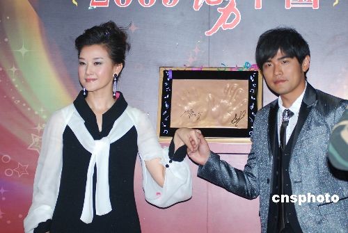 4月18日下午,“魅力相約 巔峰之和”中國北京鳥巢夏季音樂會開篇之作“2009《魅力·中國》”音樂會新聞發(fā)布會在北京舉行。6月30日,宋祖英將攜手歌劇大師多明戈、鋼琴巨星郎朗、流行天王周杰倫,在鳥巢上演一場音樂盛筵。宋祖英透露自己將在這場音樂會上演唱周杰倫的歌曲,直言最愛他的中國風(fēng)。圖為周杰倫和宋祖英一起在鳥巢留下明星手模,象征“《魅力·中國》夏季音樂會”正式啟動。此后,他們兩人的手模也將與奧運(yùn)冠軍們的手模一起被永久珍藏起來。中新社發(fā) 李學(xué)仕 攝