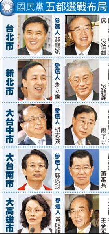 據(jù)了解,黨中央規(guī)劃的陣容,大高雄市由王金平出任,臺北市由吳伯雄擔(dān)任,新北市交給吳敦義負責(zé),大臺中市是由曾任臺中縣長的廖了以擔(dān)綱,大臺南市則由出身嘉義市的蕭萬長出馬。
