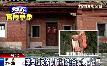 中新網(wǎng)8月3日電 谷歌地圖(google earth)在臺(tái)灣又惹上麻煩事,繼之前拍到窗臺(tái)裸女及路口“尿尿男”后,日前有民眾在谷歌地圖上發(fā)現(xiàn),李登輝的住家“翠山莊”旁邊有一間“麻將館”,誰知警察前往調(diào)查時(shí),卻發(fā)現(xiàn)被標(biāo)為“麻將館”的地方其實(shí)是空置的三合院。
