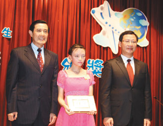 該獎項今年頒發(fā)新臺幣200萬元獎學金,共150位學生獲獎,由縣長吳志揚主持,馬英九頒獎合照。