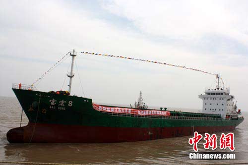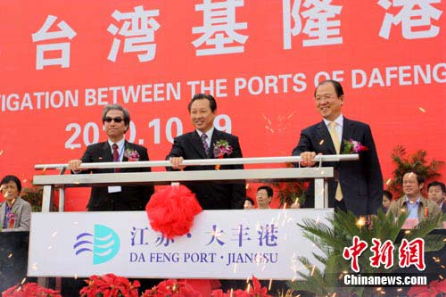 中新網(wǎng)鹽城10月19日電 (記者 于從文)19日上午11時(shí)18分,隨著中共鹽城市委書記趙鵬一聲宣布,鹽城地方政府官員與臺(tái)灣基隆港物流協(xié)會(huì)會(huì)長(zhǎng)共同啟動(dòng)拉桿,一艘“寶宏8號(hào)”貨輪緩緩離岸駛向臺(tái)灣基隆港,江蘇大豐港與臺(tái)灣基隆港實(shí)現(xiàn)首次直航。