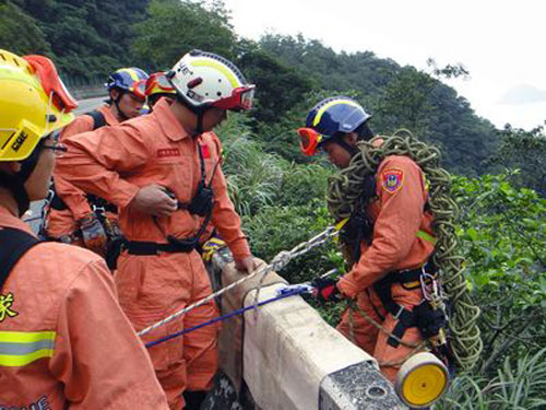 歷經(jīng)40分鐘路程,來到116公里處,前方已一大片塌方,無法再向前。不到片刻,一群身穿橘衣、步伐整齊的臺北市搜救隊朝這走來。在短暫的集合、下達指令后,搜救隊員系著繩索,一個接著一個從路邊護欄緩緩垂降,搜索生還者及車輛殘骸。