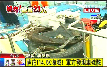 臺(tái)當(dāng)局“國防部”表示,今日上午9時(shí)40分左右,在蘇花公路114.5公里距灘10米、水深6米處,發(fā)現(xiàn)一個(gè)大型輪胎外胎與一個(gè)半內(nèi)胎、 規(guī)格為50厘米乘以50厘米的藍(lán)色皮革,疑似車體內(nèi)裝;上午10時(shí)40分,又發(fā)現(xiàn)長約2米的疑似車體支架。