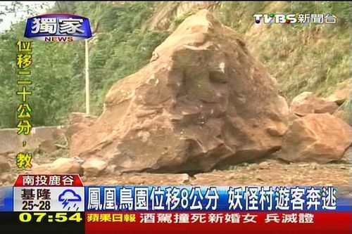 往鹿谷里面走,投56線也出現(xiàn)坍方,巨石滾下來(lái),在路面上砸出1條長(zhǎng)長(zhǎng)的裂痕,田底村13戶住戶,還有30多名采茶工人,還受困在村內(nèi),等待救援;觀光景點(diǎn)鳳凰谷鳥(niǎo)園,也因?yàn)榈嘏7,產(chǎn)生位移、樓梯下陷,地面高低落差將近8公分,園方也宣布暫時(shí)封園