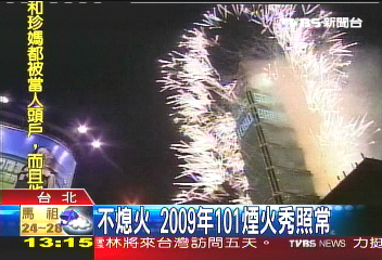 堅(jiān)持續(xù)辦煙火,但是受到不景氣影響,本來(lái)101大樓應(yīng)該在10月底就該定案決定贊助廠商,但直到現(xiàn)在都找不到贊助人選。2005年101大樓落成,舉辦了88秒的煙火秀,2006、2007則是由國(guó)際贊助商Sony舉辦了188秒的煙火秀,今年是交給臺(tái)“觀光局”辦理,但到了2009年,“獎(jiǎng)落誰(shuí)家”還是個(gè)未知數(shù)。