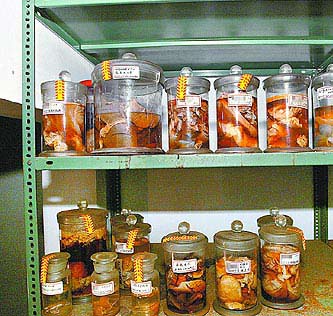 記者通過(guò)40米的通道,走到第二棟地勢(shì)較低的建筑內(nèi),記者攜帶探照燈,穿過(guò)一條白墻走道才轉(zhuǎn)彎進(jìn)入一個(gè)房間,抬頭赫見(jiàn)整排約50罐尸罐,嚇得忍不住后退。原來(lái)4排鐵架上擺放裝有各種器官和尸塊的罐子,猶如一座人體器官博物館,令人全身起雞皮疙瘩。