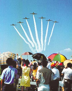 空軍雷虎小組也是遠(yuǎn)東地區(qū)第一支特技飛行小組,成立初期就以精湛技術(shù)揚(yáng)名國(guó)際。1957年,在菲律賓航空周首開(kāi)先例九機(jī)編隊(duì)表演;1959年赴美參加第一屆航空表演,以九架軍刀機(jī)做低空表演贏得贊譽(yù)。