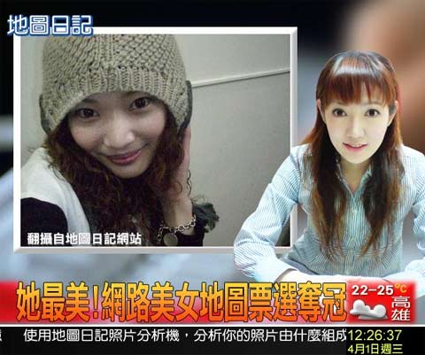 “想知道誰是臺灣最美的女性嗎?地圖日記網(wǎng)站日前舉辦美女票選,活動一個(gè)月就突破千萬的瀏覽率…”,玄藏大學(xué)大三生劉伊珊一周前上傳自拍照片,制成網(wǎng)絡(luò)美女票選奪冠的頭條新聞,沒想到還成功騙倒兩個(gè)同學(xué)。劉伊珊說,當(dāng)初只是想給同學(xué)一個(gè)驚喜,竟還有同學(xué)看到之后問,“你真的上電視喔?”