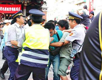 《自由時報》描述稱,學生嗆聲時,穿著武廟工作人員背心的多名男子突然沖上前,將學生往外推擠,還有人趁機出手毆打?qū)W生。警方見狀則搶下抗議標語,為避免媒體拍到標語,還蓋住標語,“以跑百米的速度”直奔派出所,并將學生帶往派出所,馬英九則在安全人員及人群的簇擁下快速進入武廟揭牌。
