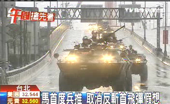 凌晨5點(diǎn),天色才剛亮起,負(fù)責(zé)保衛(wèi)博愛特區(qū)的憲兵202指揮部大批甲車緩緩開出,第二輛六輪甲車正是到中興寓所護(hù)送馬英九的萬鈞車,這是馬英九上任后,首度主持兵推。