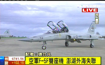 空軍司令部指出,該架F-5F戰(zhàn)機編號5410,上午11時14分由清泉崗基地起飛,前往澎湖石礁靶場執(zhí)行對地訓練課目,11時36分時戰(zhàn)機光點消失。
