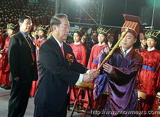 中新網(wǎng)9月27日電 2009年第二屆中華文化快車兩岸師生聯(lián)合祭孔大典今日上午在新竹隆重登場,祭孔大典更開創(chuàng)先例,透過因特網(wǎng)同步同時在新竹、北京、山東三地聯(lián)合進行,萬余名兩岸師生共同參與。親民黨主席宋楚瑜更第二度應(yīng)邀擔(dān)任祭孔大典正獻人,這也是近60年以來,臺灣民間祭孔規(guī)模最大的一次集會。
