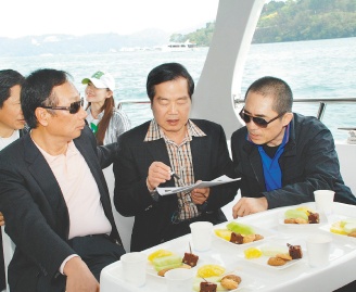 郭臺(tái)銘與李朝卿昨天并陪著張藝謀搭船游湖。為了讓張藝謀能坐在視野最好的船弦邊座位,郭臺(tái)銘還親自將靠船弦的桌上餐盤(pán)移到另一桌,笑著招呼張藝謀就座。