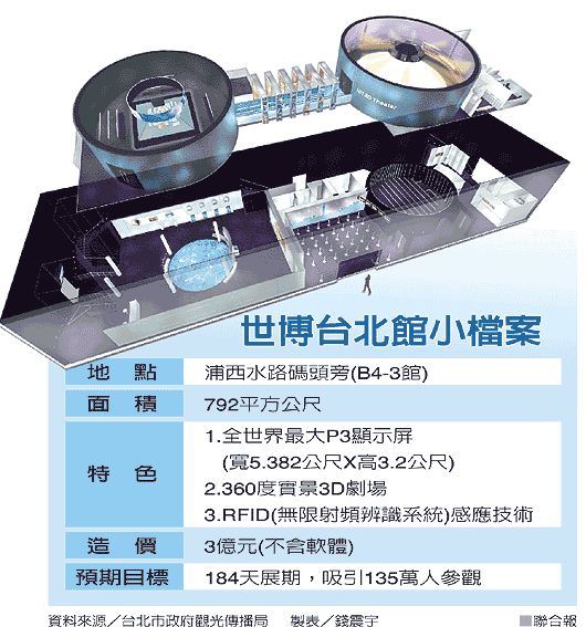 世博會臺北館館長陳慶安表示,館內一次開放84人參觀,全程參觀時間36分,以一天開放13個小時計算,約有2184人參觀。臺北館預計4月16日完工驗收,4月20日開放試營運。