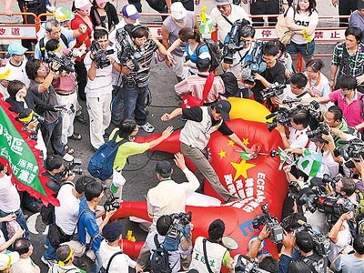 在臺北游行的一些綠營民眾因不滿馬英九與大陸簽署經(jīng)濟(jì)合作架構(gòu)協(xié)議(Economic Cooperation Framework Agreement,ECFA),準(zhǔn)備了紅色巨型充氣馬玩偶,上面畫有我五星紅旗標(biāo)志,還寫著“ECFA傾中賣臺”等文字,并煽動民眾踢踹泄憤。