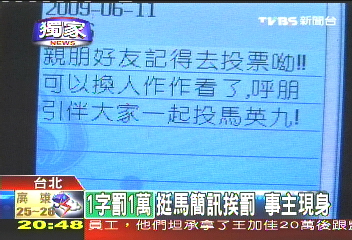 據(jù)臺灣TVBS電視臺報道,去年臺灣地區(qū)領(lǐng)導(dǎo)人選舉投票當(dāng)天,一名馬英九支持者發(fā)送了一則50字短信幫馬助選,事后因違反島內(nèi)選舉規(guī)定,被罰50萬元(新臺幣,下同),成為臺灣史上最貴的短信,1字等于1萬元。這名男子黎煌雷昨天接受媒體訪問,認(rèn)為傳短信是私人行為,并沒有公開助選,因此不服處罰。