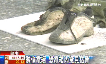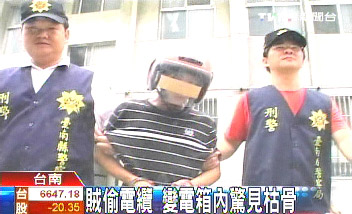 據(jù)臺灣TVBS電視臺報道,臺南縣一名小偷潛入歇業(yè)的工廠偷電纜,意外發(fā)現(xiàn)變電器箱里竟有一具白骨。據(jù)臺灣警察分析,死者可能是要偷電纜意外觸電,死亡時間超過2年;發(fā)現(xiàn)白骨的竊賊,也因為留在現(xiàn)場,通緝犯身份曝光,被帶回警局。