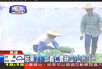 中新網(wǎng)7月20日電 據(jù)臺灣TVBS報(bào)道,臺當(dāng)局前“國安會秘書長”邱義仁5月初南下高雄務(wù)農(nóng),經(jīng)過2個多月,他種的絲瓜現(xiàn)在已經(jīng)結(jié)實(shí)累累,3天前邱義仁開始采收,10多箱的絲瓜經(jīng)由產(chǎn)銷班賣到臺北,1公斤的價格大概新臺幣18元,邱義仁的好友戴振耀說,受到臺風(fēng)影響,價格不算好,不過總算是邱義仁當(dāng)農(nóng)夫交出的第一張成績單。