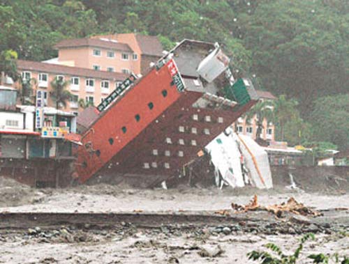 有二十二年歷史的金帥飯店昨天中午十一時(shí)三十八分,不敵激濁的山洪,在對(duì)岸圍觀群眾驚叫聲中,瞬間倒入知本溪中,附近十棟民宅與商店也被沖走。海岸山脈另一頭的紅葉溫泉全部被埋在土石流里,還好當(dāng)?shù)刂挥袦厝O(shè)施,沒有飯店,不然不堪設(shè)想。