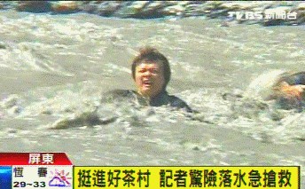 中新網(wǎng)8月17日電 據(jù)臺灣TVBS報道,屏東“好茶村”在風(fēng)災(zāi)中受重創(chuàng),多位記者隨村民挺進家園,希望能為外界報道受災(zāi)情況,沒想到在橫渡“隘寮溪”時,一名攝影記者不小心被大水沖走,情況非常驚險,還好好茶村民經(jīng)驗豐富,立刻到下游淺水處一把拉住這名記者,人平安無事,但他手中緊握不放的攝影機卻毀了。