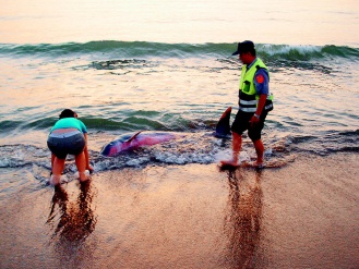 金山派出所昨天清晨5時(shí)接獲婦人報(bào)案,指出水尾沙灘有海豚擱淺。警員郭光明趕到現(xiàn)場(chǎng)察看,發(fā)現(xiàn)海豚困在沙灘,腹部擦傷滲血;郭與發(fā)現(xiàn)婦人想一起把海豚推回海里,但太重,而且海豚緊張地從噴氣孔噴氣,兩人擔(dān)心弄傷海豚,不敢再動(dòng)。